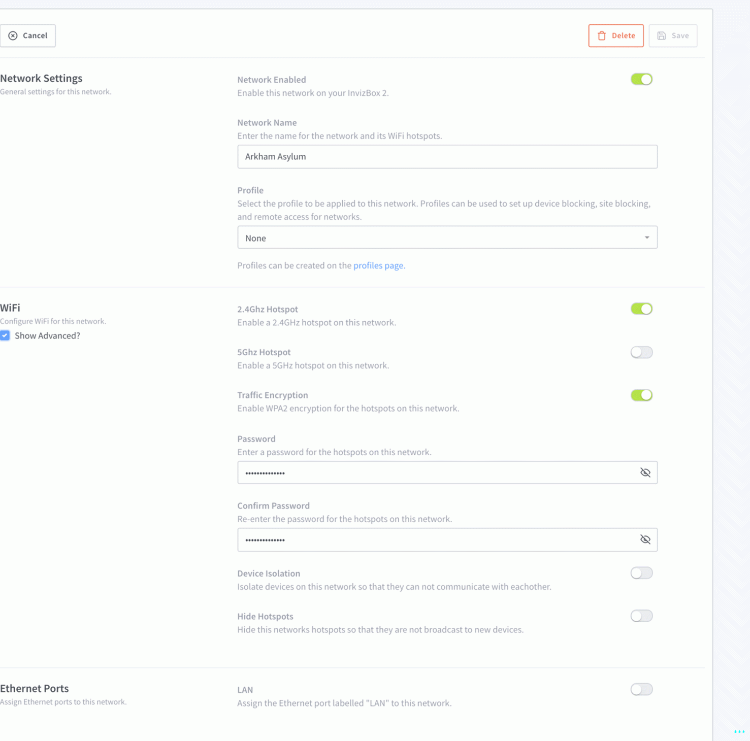 InvizBox 2, оснащенный двухдиапазонным радиоприемником 2,4 / 5 ГГц, поддерживает до восьми сетевых идентификаторов, каждый из которых назначен отдельному сетевому SSID: