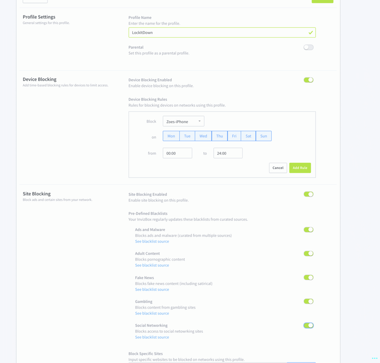 InvizBox 2 имеет ряд контент-фильтрации и подключения контролирует тоже. Вы можете настроить родительский контроль, а также блоки для социальных сетей, игровых сайтов, рекламных доменов, известных вредоносные домены и даже поддельные новостные сайты на основе хоста с открытым исходным кодом черные и белые списки.