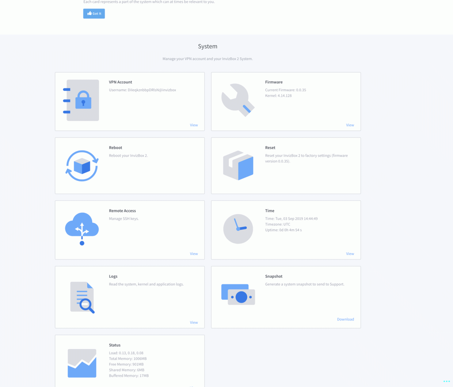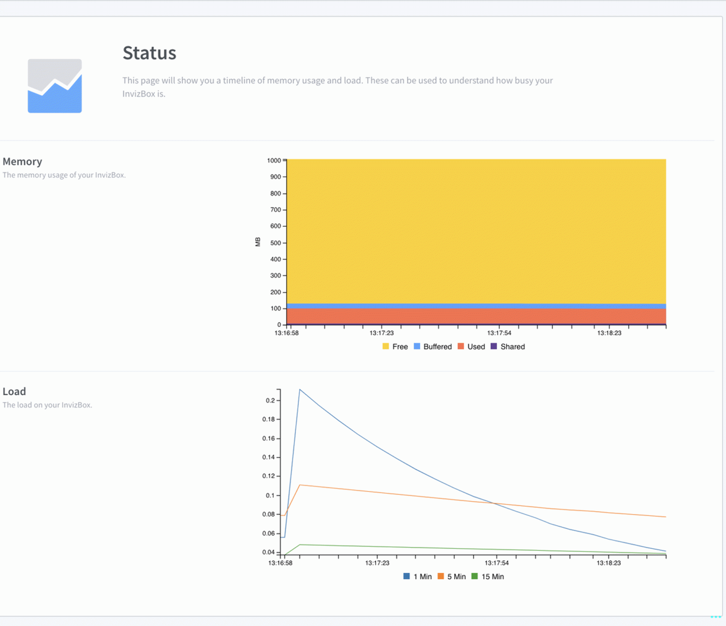 Страница состояния показывает память и нагрузку обработки на InvizBox 2 маршрутизатор.