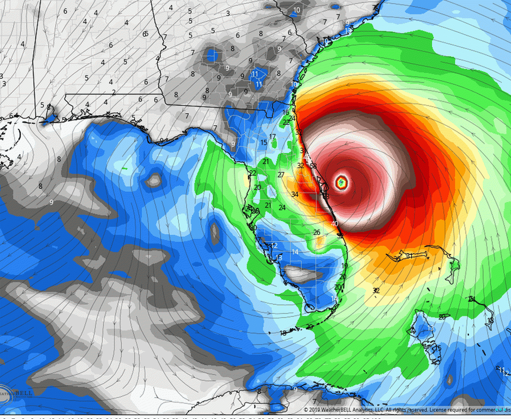 Приближаясь или касаясь побережья Флориды, Дориан, скорее всего, изгиб вдоль западной периферии хребта высокого давления, который должен держать это довольно близко к параллели к побережью США. Дориана центр может приблизиться или ненадолго совершить посадку в Грузии или Каролин. Штормовой нагон, ветры и сильные внутренние осадки – все это значительные угрозы, когда Дориан поднимается на юго-восток Юнайтед Штаты атлантического побережья.